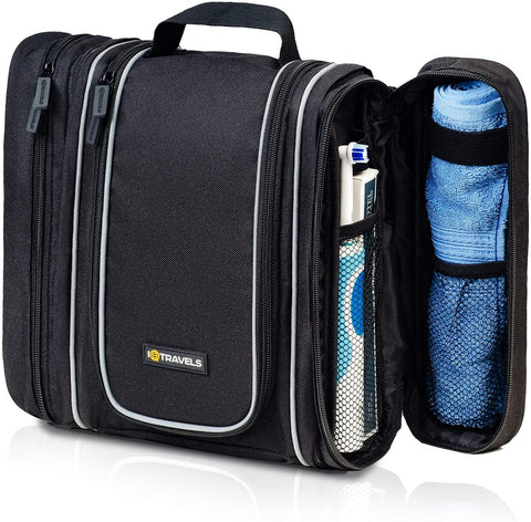 The bag is designed with 3 compartments to keep your toiletries neatly, functionally organized and easily accessible, front compartment is with 2 zippered see-through waterproof pockets with elastic band inside to fix travel size TSA toiletries in place without leakage; Middle compartment is for toothpaste and toothbrush specially to keep them hygienic; Back compartment is feasible for your other essentials such as shaving kit, mouthwash and lip balm etc.